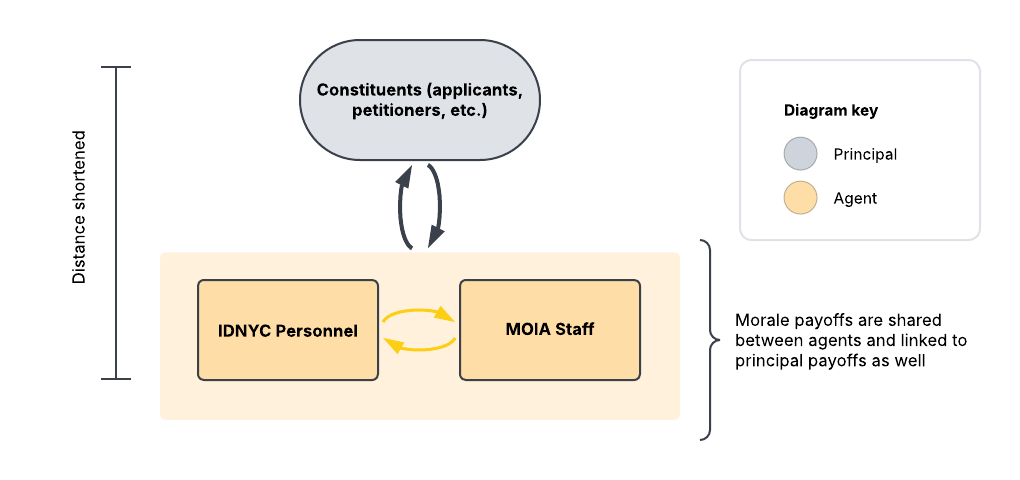The first reform is easier to implement and has two major implications. Firstly, increasing communication between all parties reduces structural hierarchies; it forces agents and supervisors to work together for the benefit of the principal. It also allows agents and supervisors to work together, effectively turning the issue into a multiple-agent-single-principal interaction (Figure 2). Secondly, enhancing communication between all parties also allows payoffs to be redistributed; if agents know from principals the outcome of their applications, agents can experience positive morale payoffs when principals receive positive material payoffs. Integrating these communication mechanisms through a systematic workflow would solidify communication between parties as a central element of the IDNYC-MOIA partnership and carries other benefits as well. For instance, it produces an incentive schedule that will motivate agents to deliver more acceptances without necessarily compromising their vetting procedures (assuming multiple agents and redundancies help self-regulate errant acceptances). It also makes agents and principals more proximal, allowing that payoff coordination to contribute to the incentive schedule outlined above.