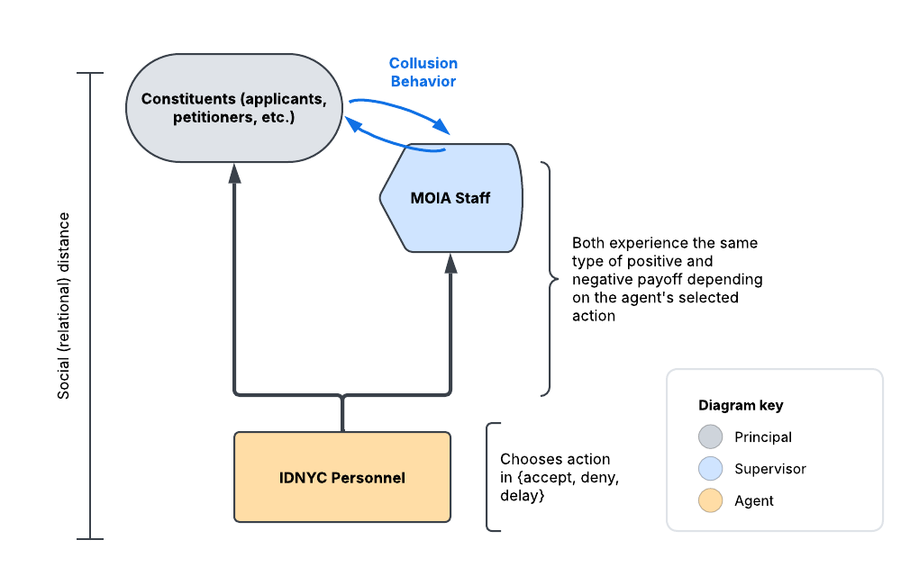 Figure 1: This chart shows the relationships between all players in the MOIA-IDNYC partnership where the diagram key indicates their role within the principal-agent-supervisor framework. Note that principals and supervisors engage in collusion behavior (marked in blue) to limit the actions of the agent. Payoffs are experienced similarly between principals and supervisors while agents receive no payoffs; also of note, the social/relational distance between principals and agents is relatively high while supervisors are much closer to principals.
