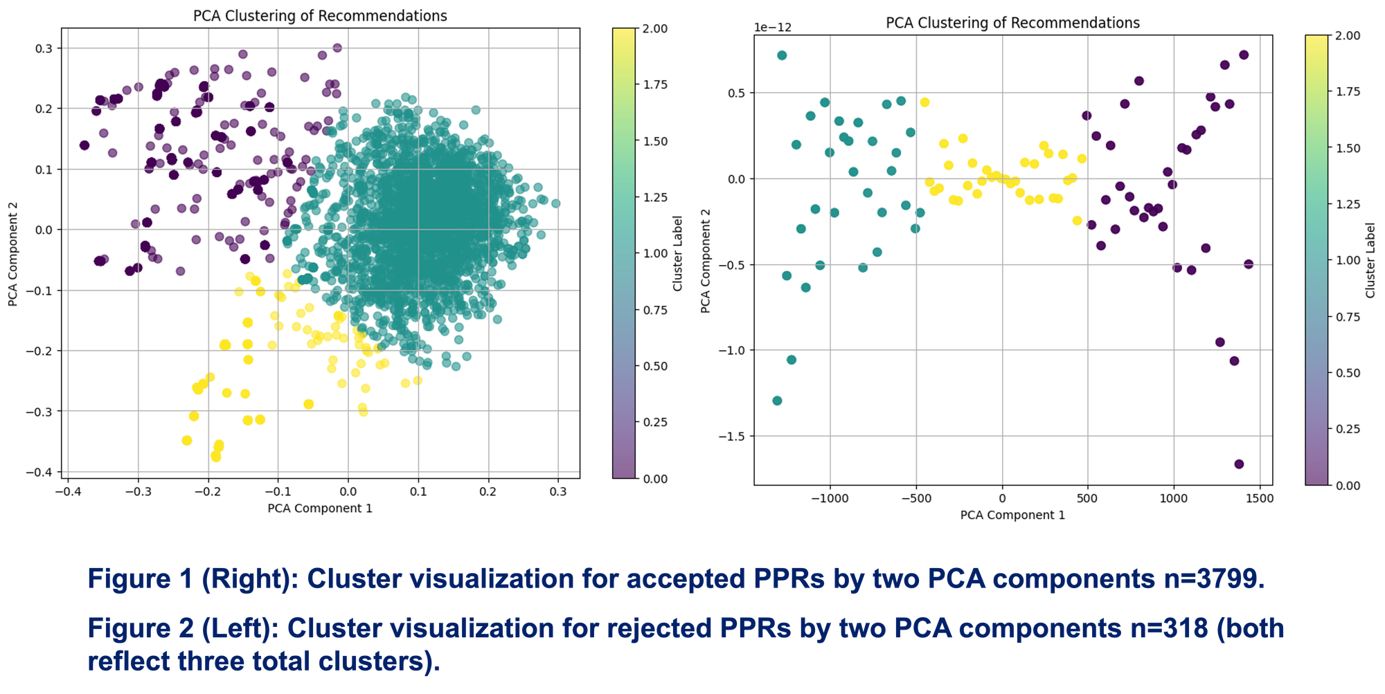 - PPRs were clustered around other similar recommendations using K-Means clustering (with the optimal number of clusters determined by the Elbow Method; n=3 clusters for both accepted and rejected groups).