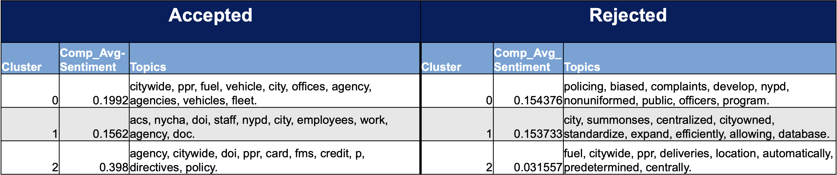 Accepted PPRs relate to administrative efficiency, financial control, and citywide system management (emphasizing technical improvements and procedural compliance). Rejected PPRs, by contrast, concentrate on politically sensitive or incident-driven issues such as policing, bias complaints, legal disputes, and personnel conflicts. Even where subject matter overlaps, accepted proposals address neutral, citywide logistics, while rejected PPRs link to enforcement or accountability contexts. In effect, the clustering reveals a structural preference for process-oriented reforms over corrective or disciplinary interventions.